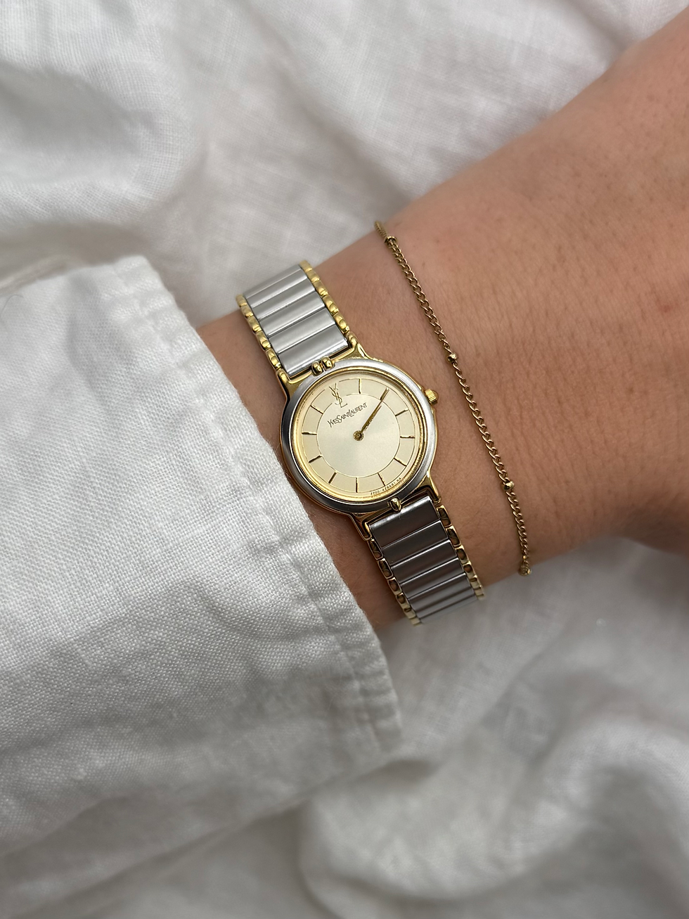 Rare vintage Favre-Leuba Geneva bangle watch with white Roman numeral dial, steel and yellow gold. Expandable rope detail bangle.